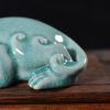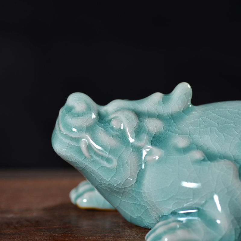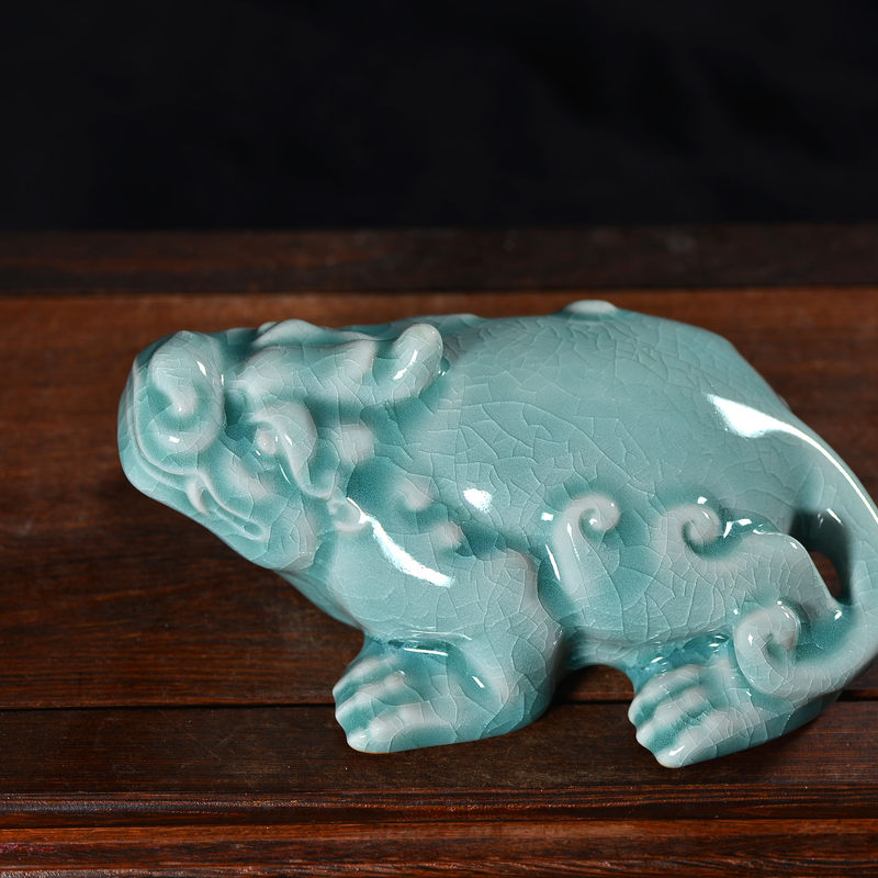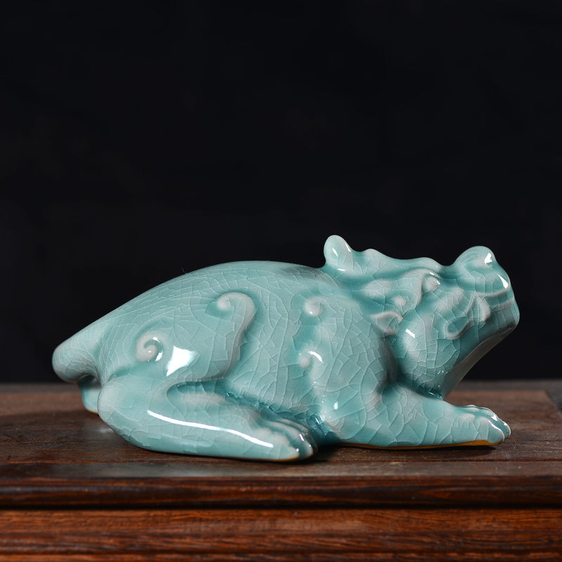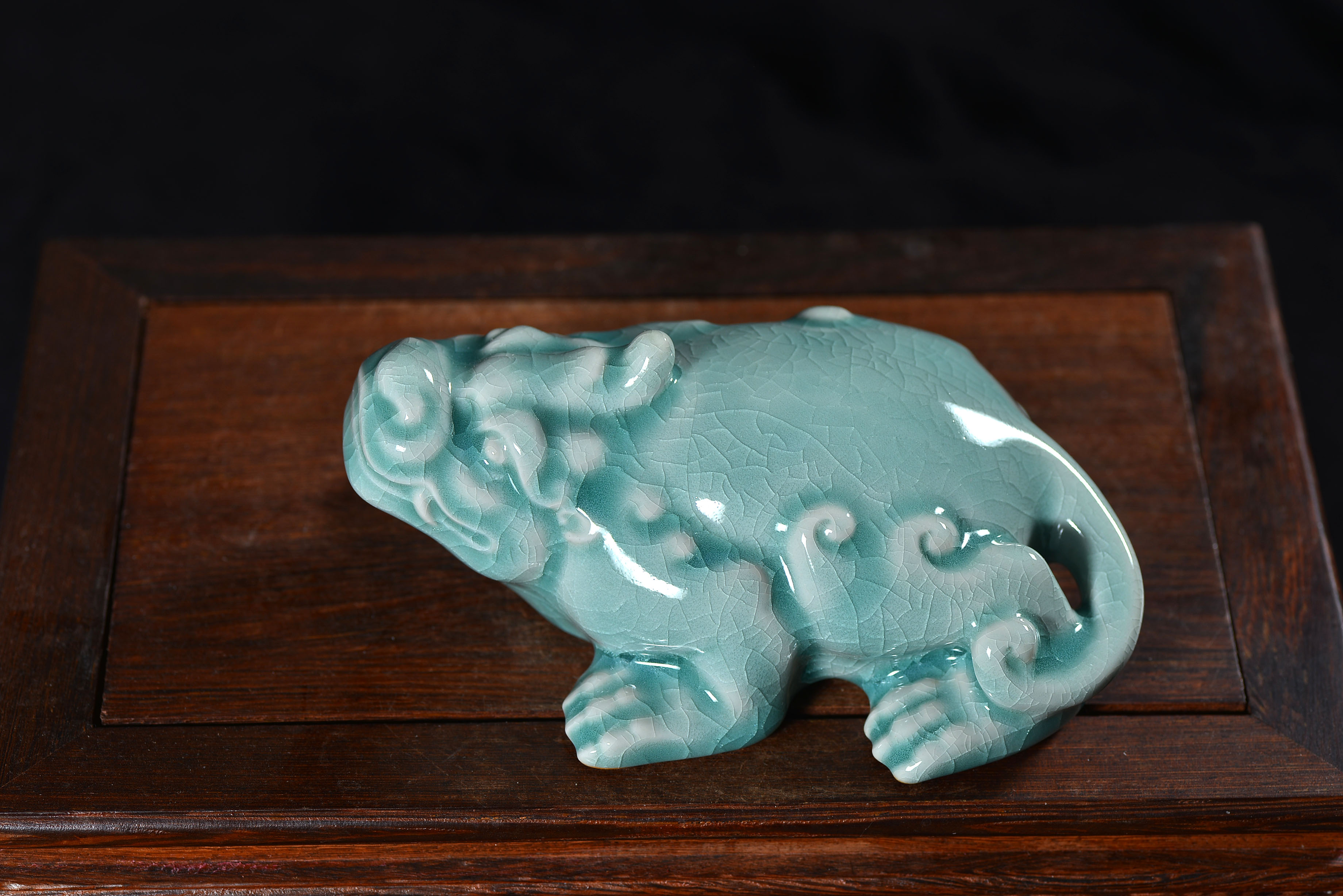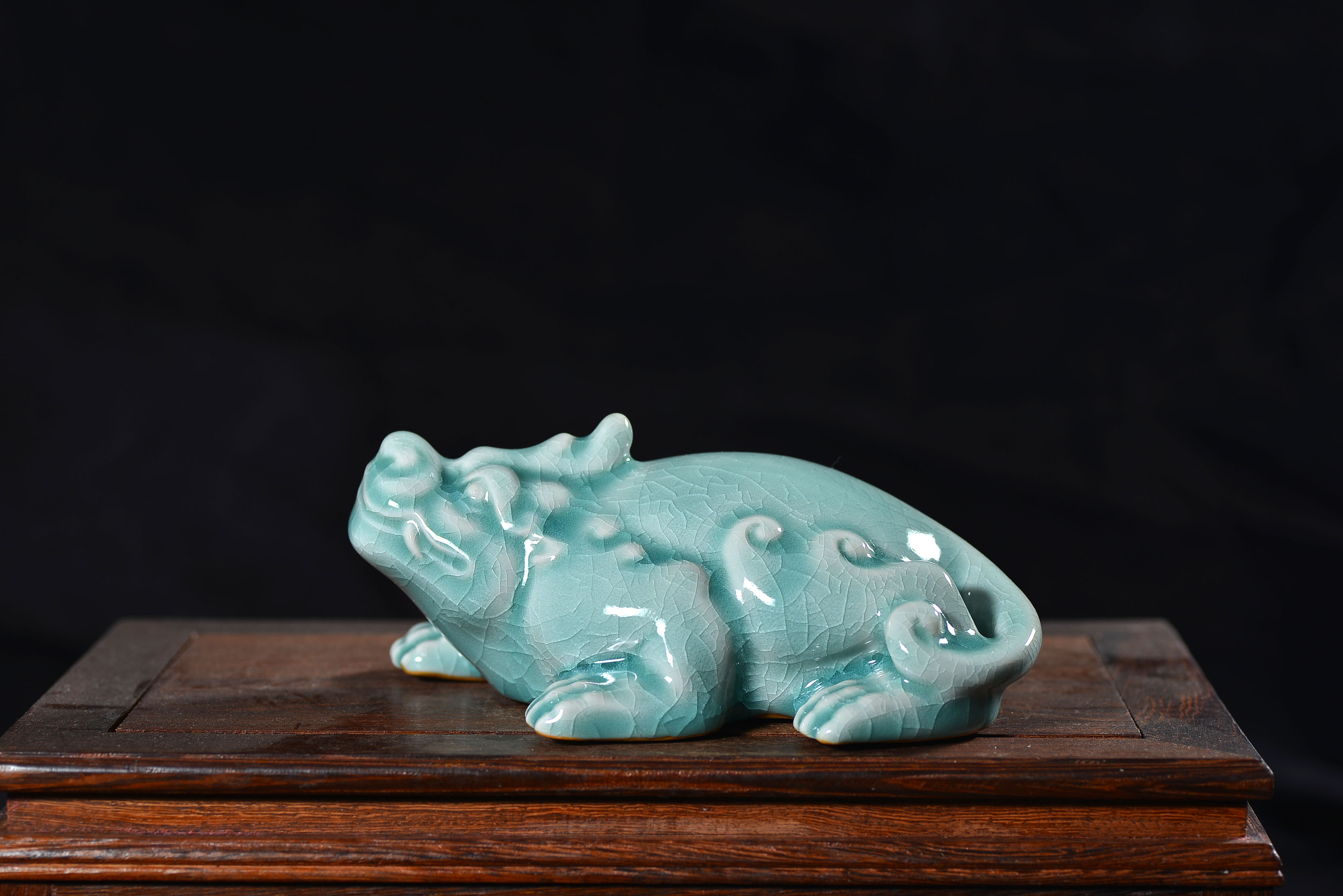 清凉寺仿古釉天青色 龙龟摆件 长16厘米 宽12厘米 高6.5厘米 全品无瑕疵 收藏使用佳品。 收藏使用佳品。清凉寺汝瓷是中国北宋时期的主要代表瓷之一,属于五大名窑之一。清凉寺汝瓷的历史可以追溯到北宋时期,当时的宋王朝为了满足宫廷的特殊需要,设立了汝官窑。这个窑场生产的汝瓷以其独特的美学风格和高*的制作工艺而闻名,被视为青瓷之典范。清凉寺汝官窑遗址是在上世纪被发现的,这一发现揭开了汝官窑消失的千古之谜。自1987年以来,河南省文物考古研究所对清凉寺汝窑遗址进行了多次发掘,发现了大量重要的烧造设施和汝窑瓷器标本。清凉寺汝瓷的艺术特色体现在其独特的制作工艺和美学风格上。它以其工艺精湛、造型秀美、釉面蕴润、高雅素净的丰韵而独具风采。汝瓷的制作工艺包括使用名贵玛瑙为釉,釉色独特,随光变幻,呈现出“雨过天晴云破处”“千峰碧波翠色来”的美妙效果。此外,汝瓷的胎体厚重,釉厚而声如磬。汝瓷的形状古朴大方,器表呈蝉翼纹细小开片,具有“梨皮、蟹爪、芝麻花”的特点。这些装饰手法使得汝瓷不仅美观而且富有变化,被世人称为“似玉、非玉、而胜玉”。
