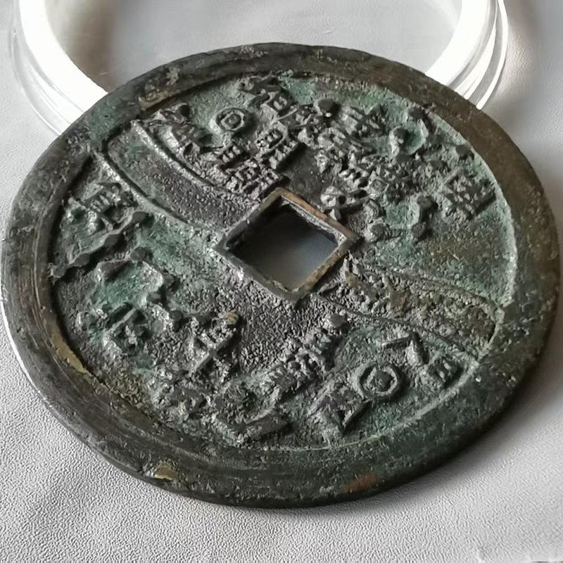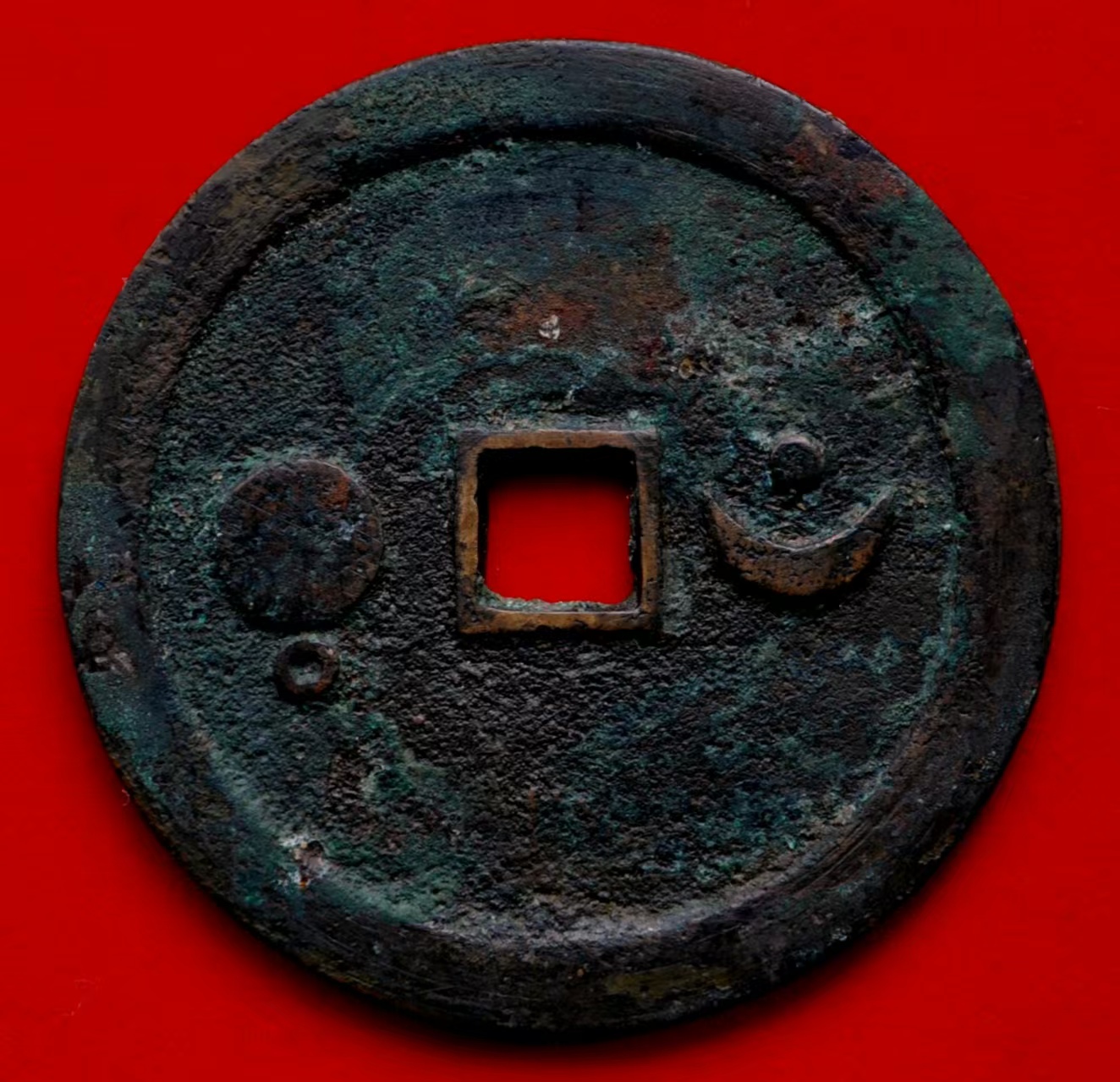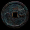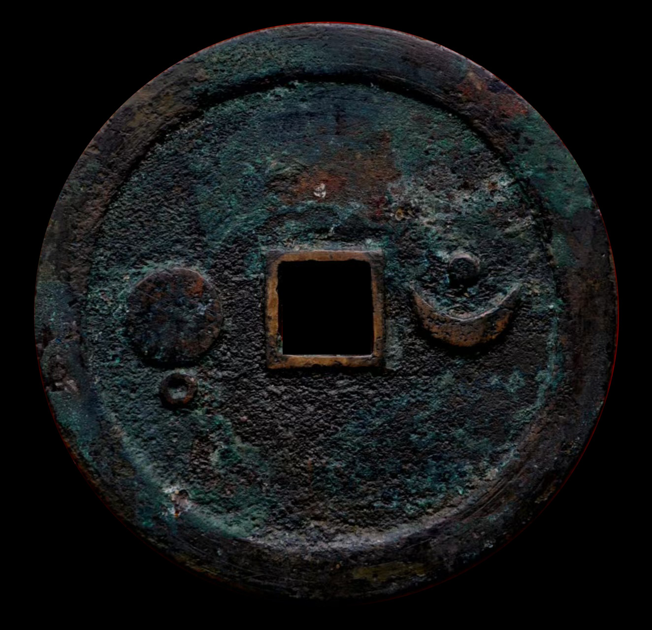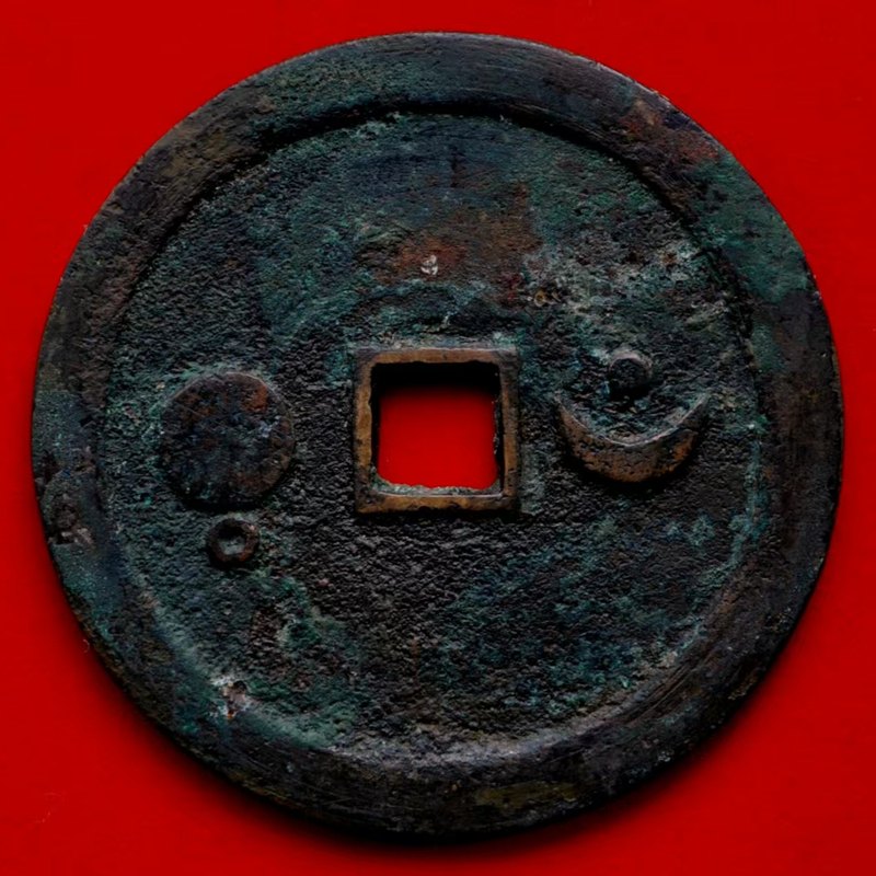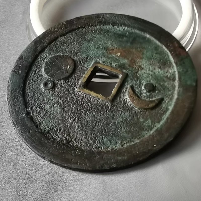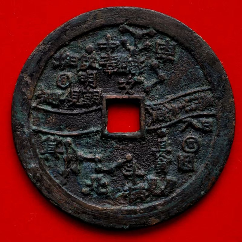 此外,还有直径7.6厘米左右的巨星、竖月孕星版式,笔者认为应是3式的后期翻铸改版。需特别说明的是,日本在明治及以后翻铸、仿铸了大量的这类星宿图花钱,有一种背巨星、仰月(月角指向外郭)的版式即为日本仿铸,此式直径近8厘米,厚度略薄,铜色偏红,表面多呈日本近现代铜器典型的栗色仿古包浆。
