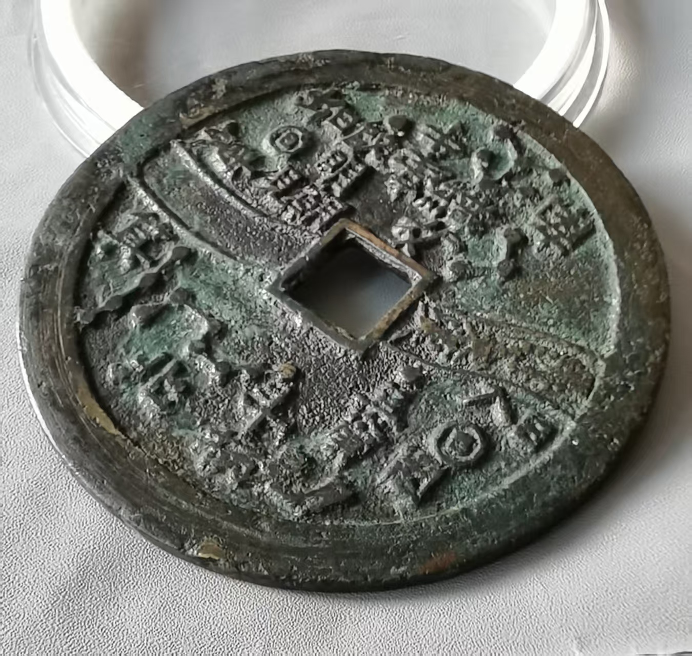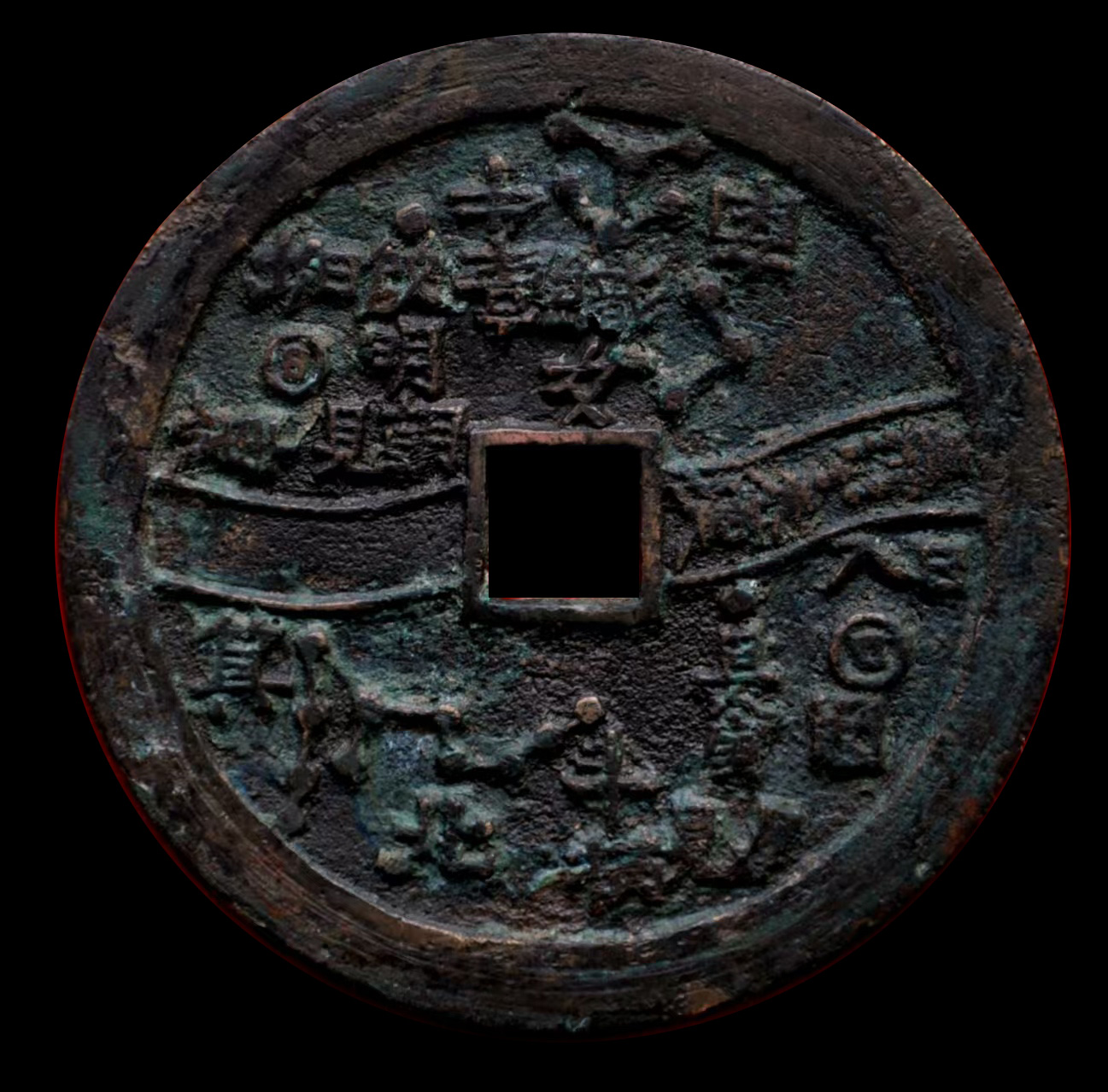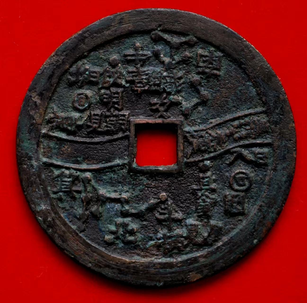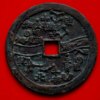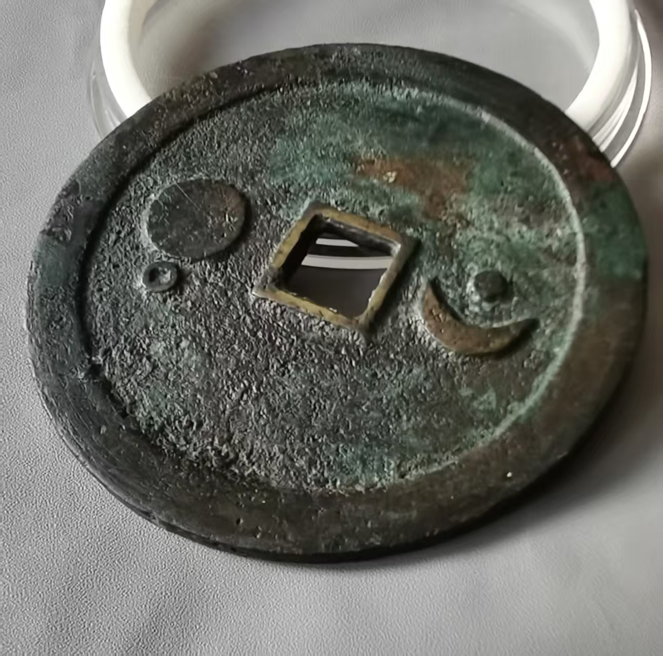 此外,还有直径7.6厘米左右的巨星、竖月孕星版式,笔者认为应是3式的后期翻铸改版。需特别说明的是,日本在明治及以后翻铸、仿铸了大量的这类星宿图花钱,有一种背巨星、仰月(月角指向外郭)的版式即为日本仿铸,此式直径近8厘米,厚度略薄,铜色偏红,表面多呈日本近现代铜器典型的栗色仿古包浆。