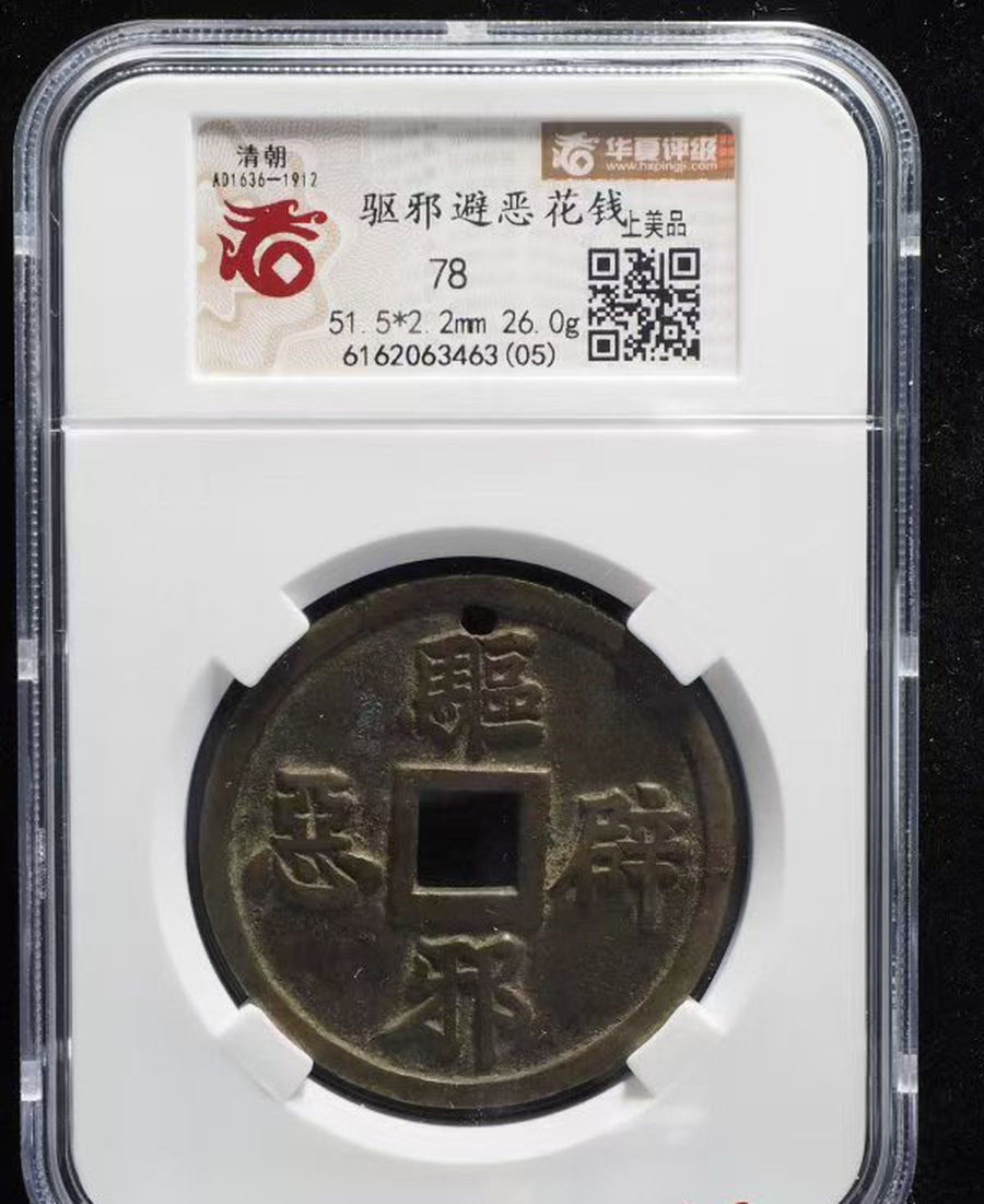 图录号009 龟蛇七星剑吉语花钱 质地:铜 质量:26.0g 尺寸:51.5x51.5x2.2mm 大热门清花,驱邪避恶背龟蛇北斗剑花钱,题材少见,传世品相,包浆熟美,字口清晰,老辣自然,面书驱邪避恶,对读;背穿上蛇、穿下灵龟,为分体玄武,穿左右分别为驱邪剑、北斗星,字口清晰自然,图案精美考究,文化气息浓郁,题材好、寓意好,尺寸硕大,版模状态好,难得难遇,已入盒,推荐收藏。