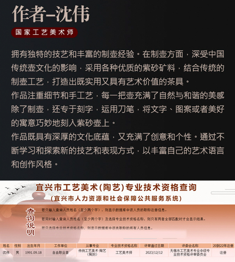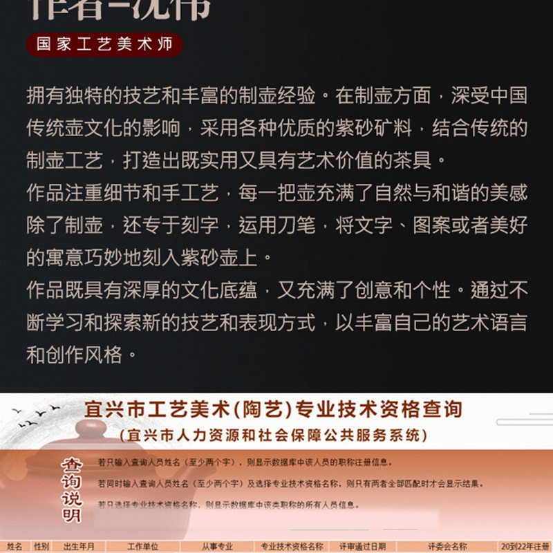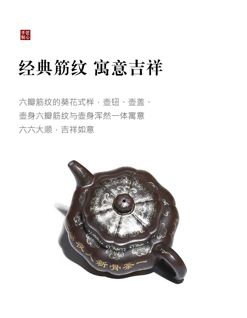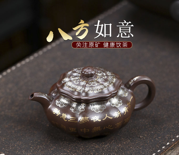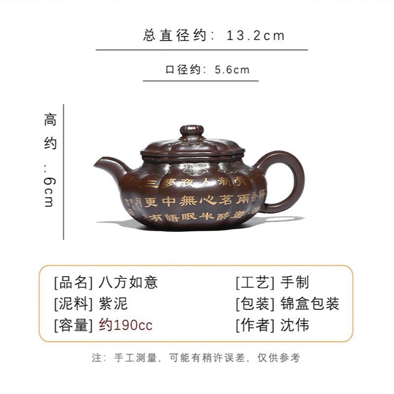 宜兴原矿无添加手工八方如意紫砂壶,手工描金:一杯清茶香入骨·两盏新茗醉人心。半夜无眠梦中语·三更有意月光矜。山中无事不相亲·一日茶声两度长。今夕清风吹酒醒·满身明月照诗人。日常养壶包浆温润,不用特意去淋壶·用剩余喝不完的茶浇淋壶身茶巾擦干净保持壶身的干净整洁就好茶壶款识 真品印证,紫砂壶的款式鉴别作者和价值的重要佐证,也是文博古玩和拍卖界对壶估价依据,郑重承诺:一壶一证书,一壶一检测,此款壶是沈伟老师手制,印章清晰可见,值得收藏