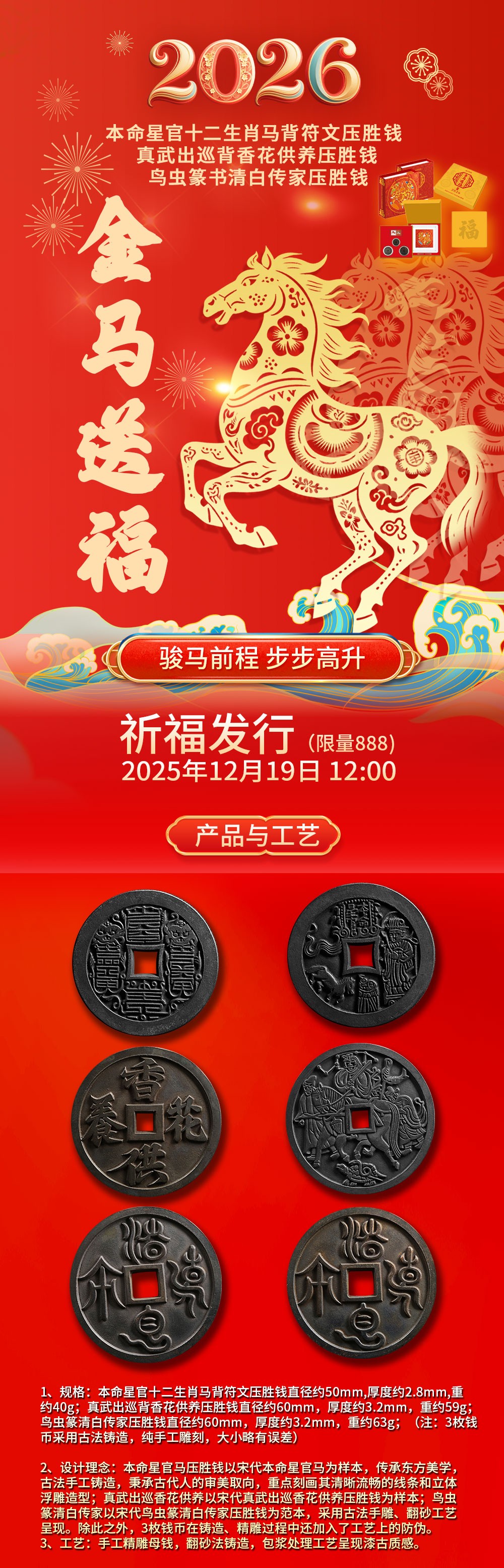 本场迎新春特别拍卖会,全部甄选吉物,为马年加油,其中丙午马年压胜钱礼盒限量呈现5份,本命星官马压胜钱以宋代本命星官马为样本,传承东方美学,古法手工铸造,秉承古代人的审美取向,重点刻画其清晰流畅的线条和立体浮雕造型;真武出巡香花供养以宋代真武出巡香花供养压胜钱为样本;鸟虫篆清白传家以宋代鸟虫篆清白传家压胜钱为范本,采用古法手雕、翻砂工艺呈现。除此之外,3枚钱币在铸造、精雕过程中还加入了工艺上的防伪。手工精雕母钱,翻砂法铸造,包浆处理工艺呈现漆古质感。机会难得,值得收藏。