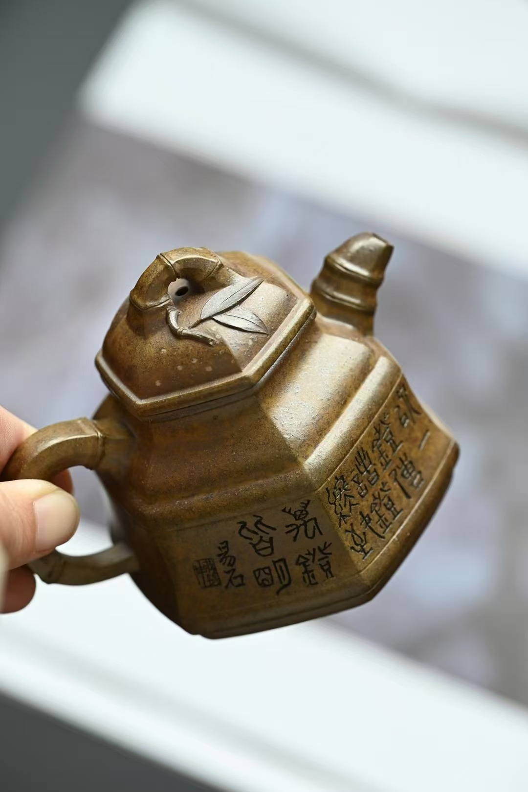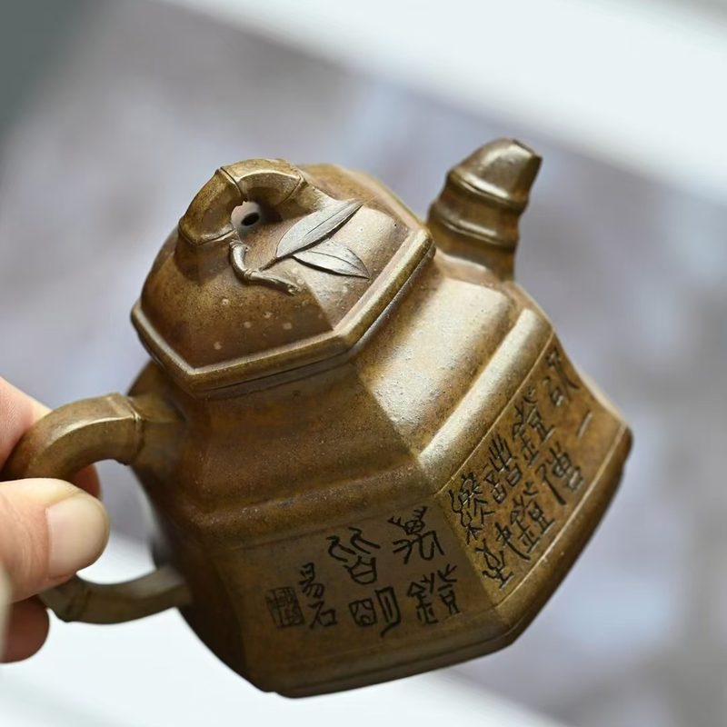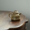 六瓣竹鼎套组 ,手工制作,容量 160cc 葵黄泥,柴烧法 高级工艺师 蒋锡坤 作品 壶的立面筋线,自下而上贯通,与嘴、把沟通而浑成一体。壶嘴饰六条竹纹线,壶把方中带圆,刚劲有力,稳重中又不失灵秀,具有节奏之美。
