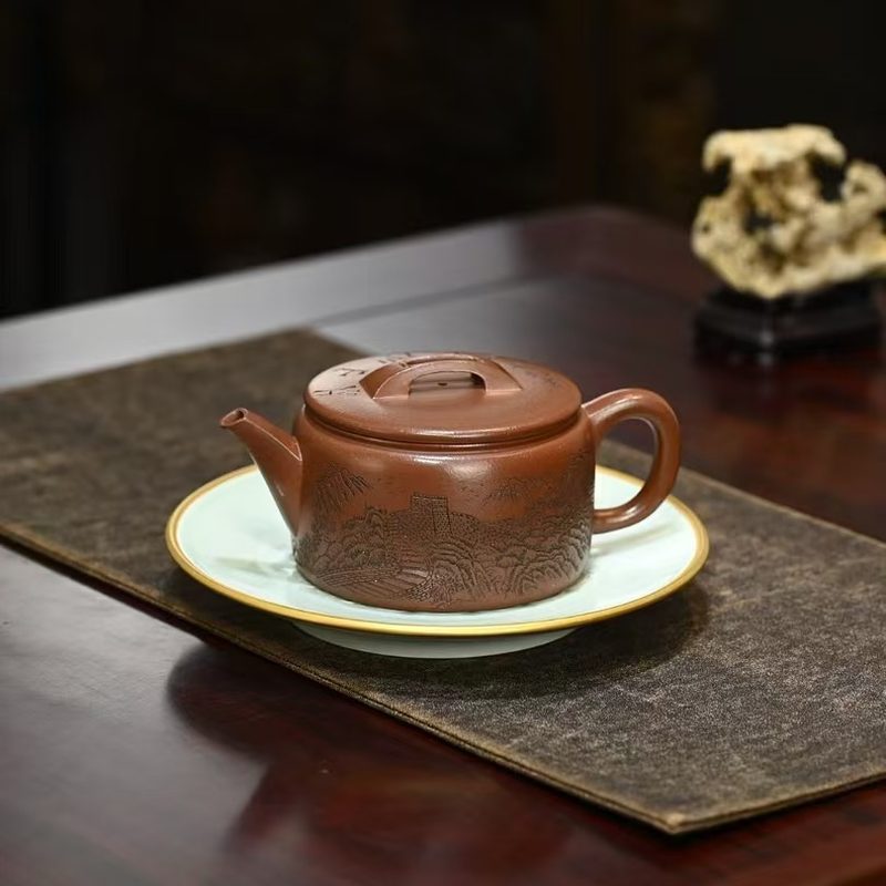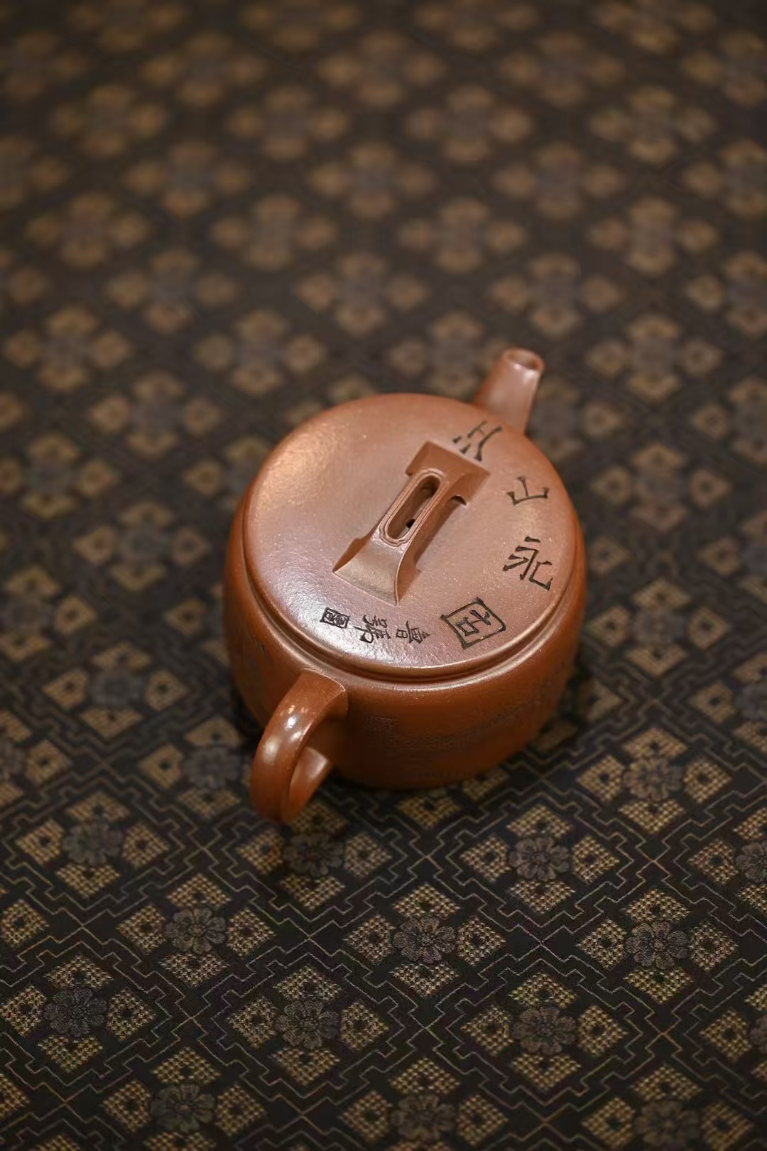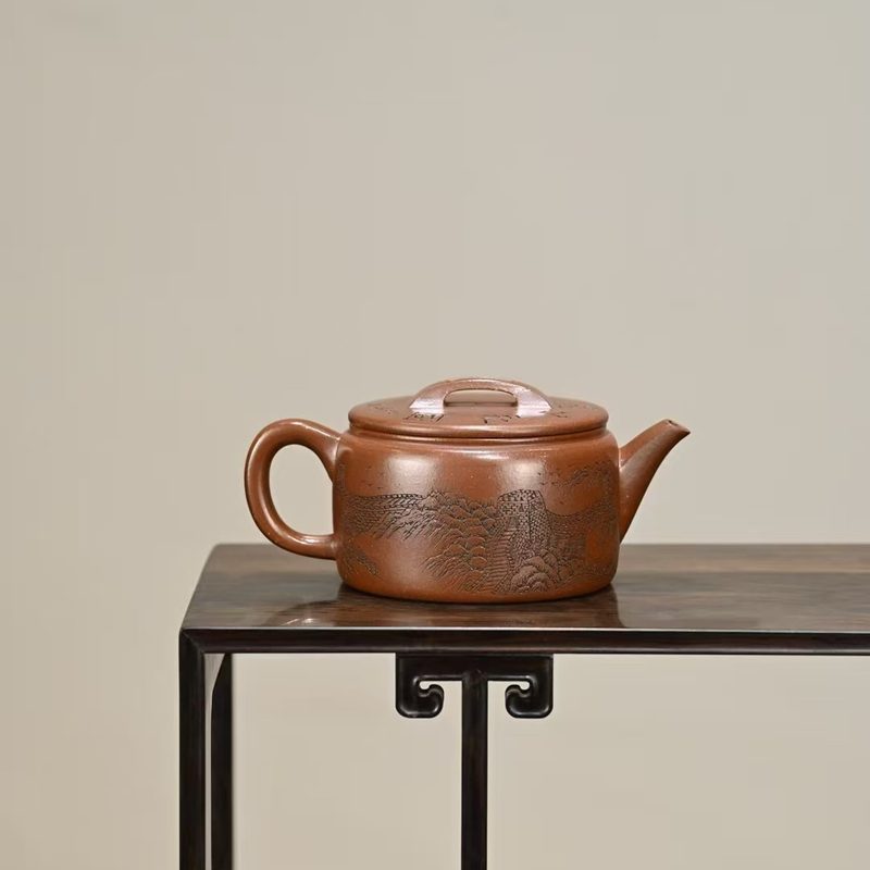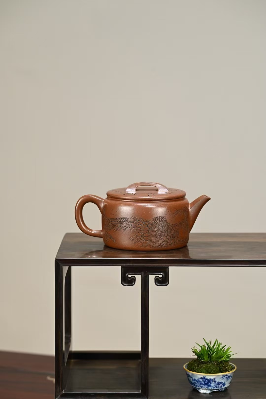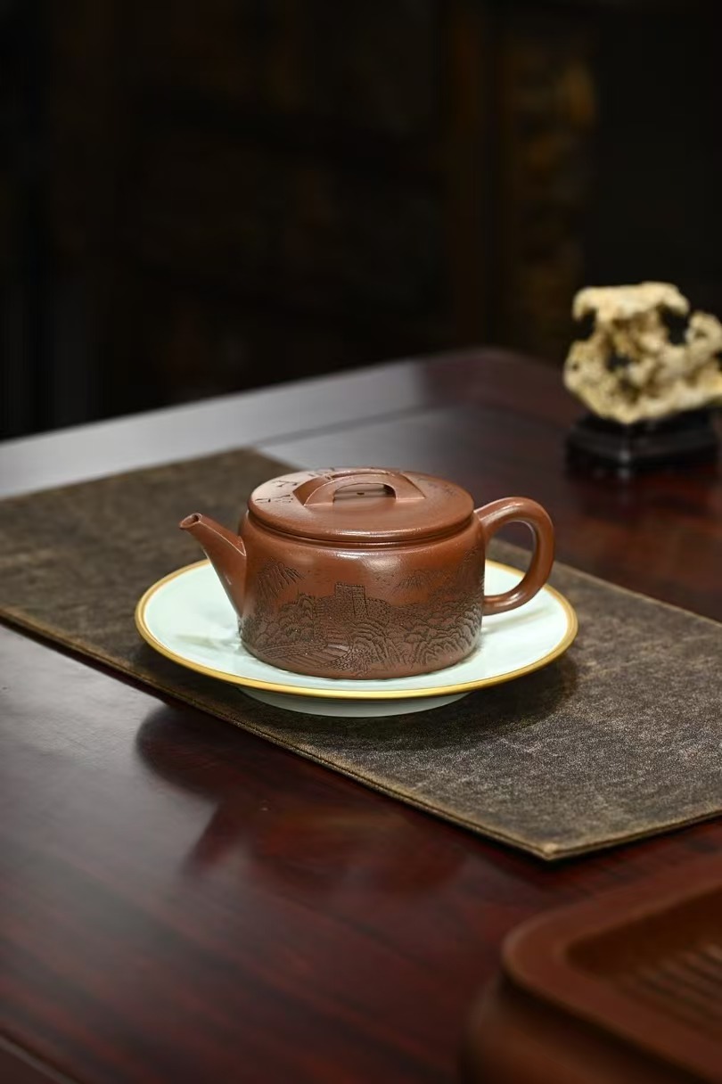 汉瓦 手工制作, 容量300cc ,原矿底槽清泥料, 高级工艺师 蒋锡坤 作品 以‮典经‬汉瓦为原型,辅‮精以‬妙的设计,少了一分笨拙,多了一分简练雅致,在紫砂壶上呈现顶级的小楷刻字艺术,把‬丰富的‮史历‬文化凝聚在‮壶小‬之上,高级大气。