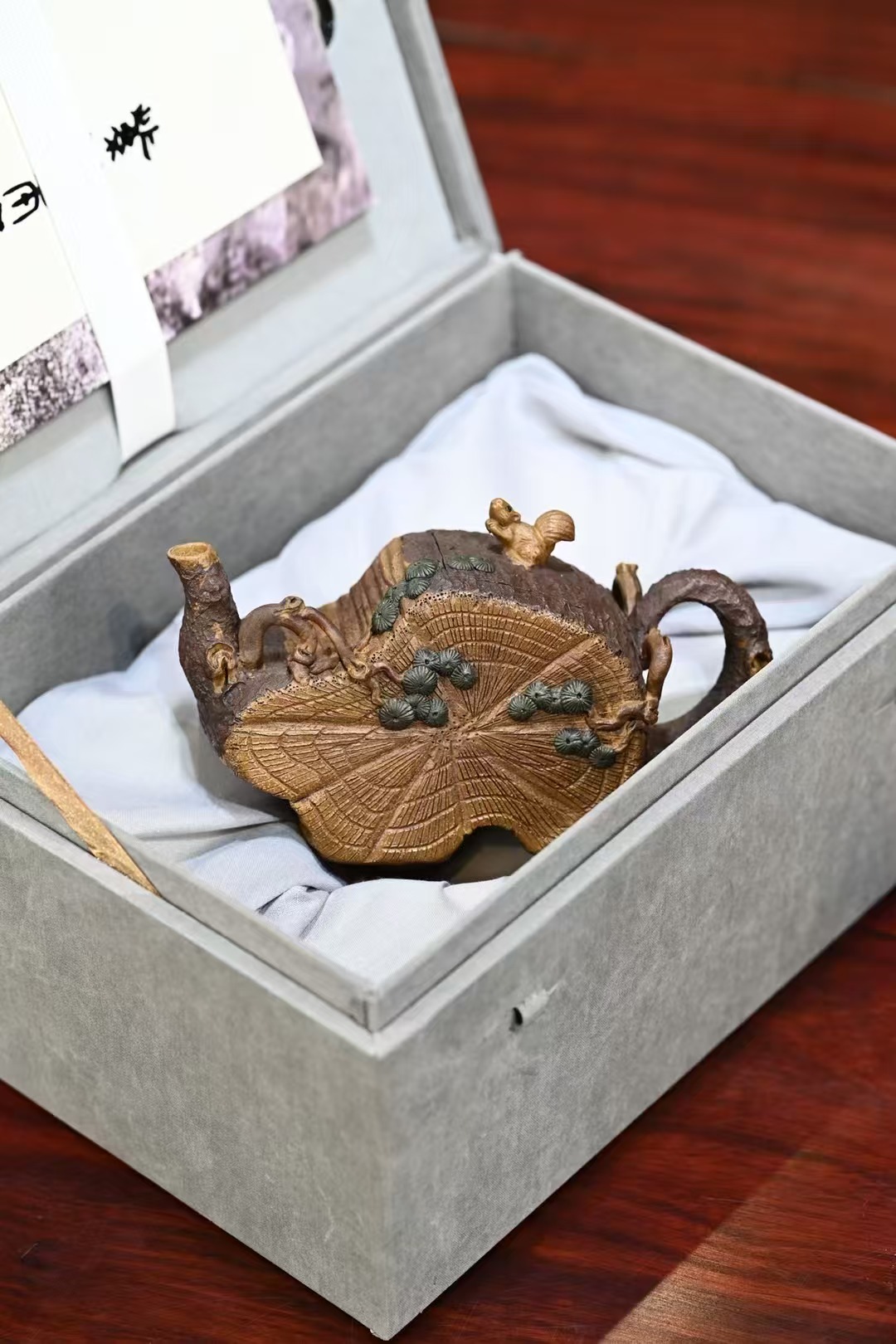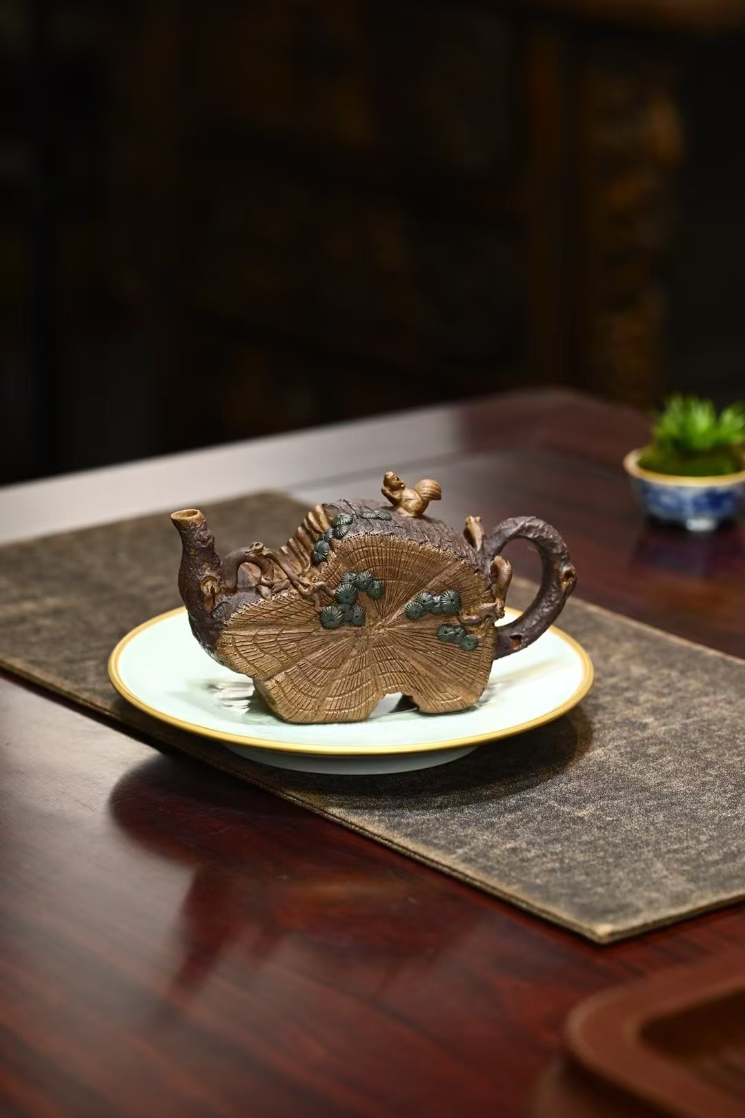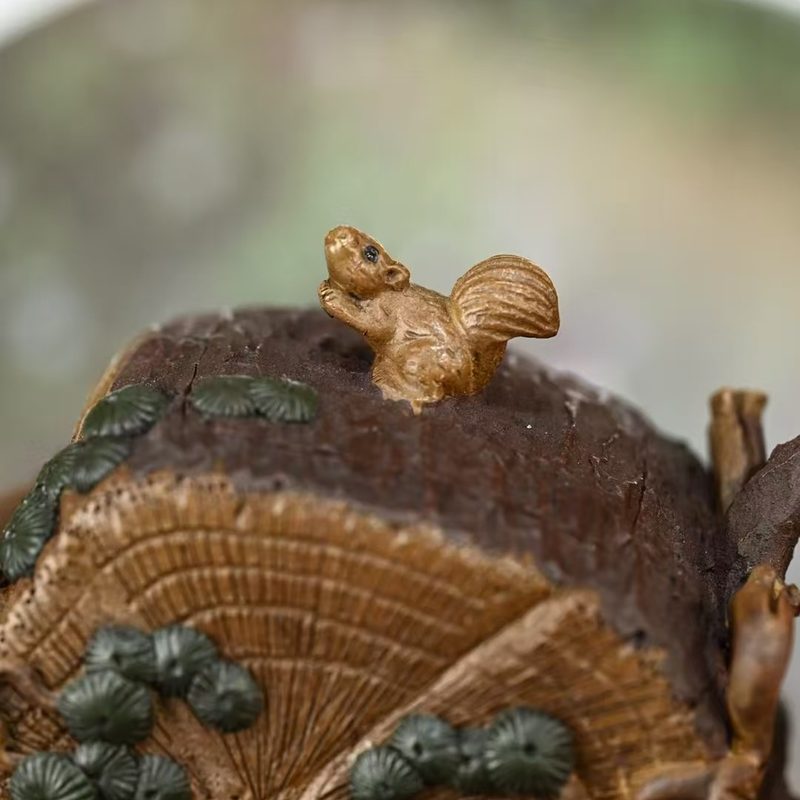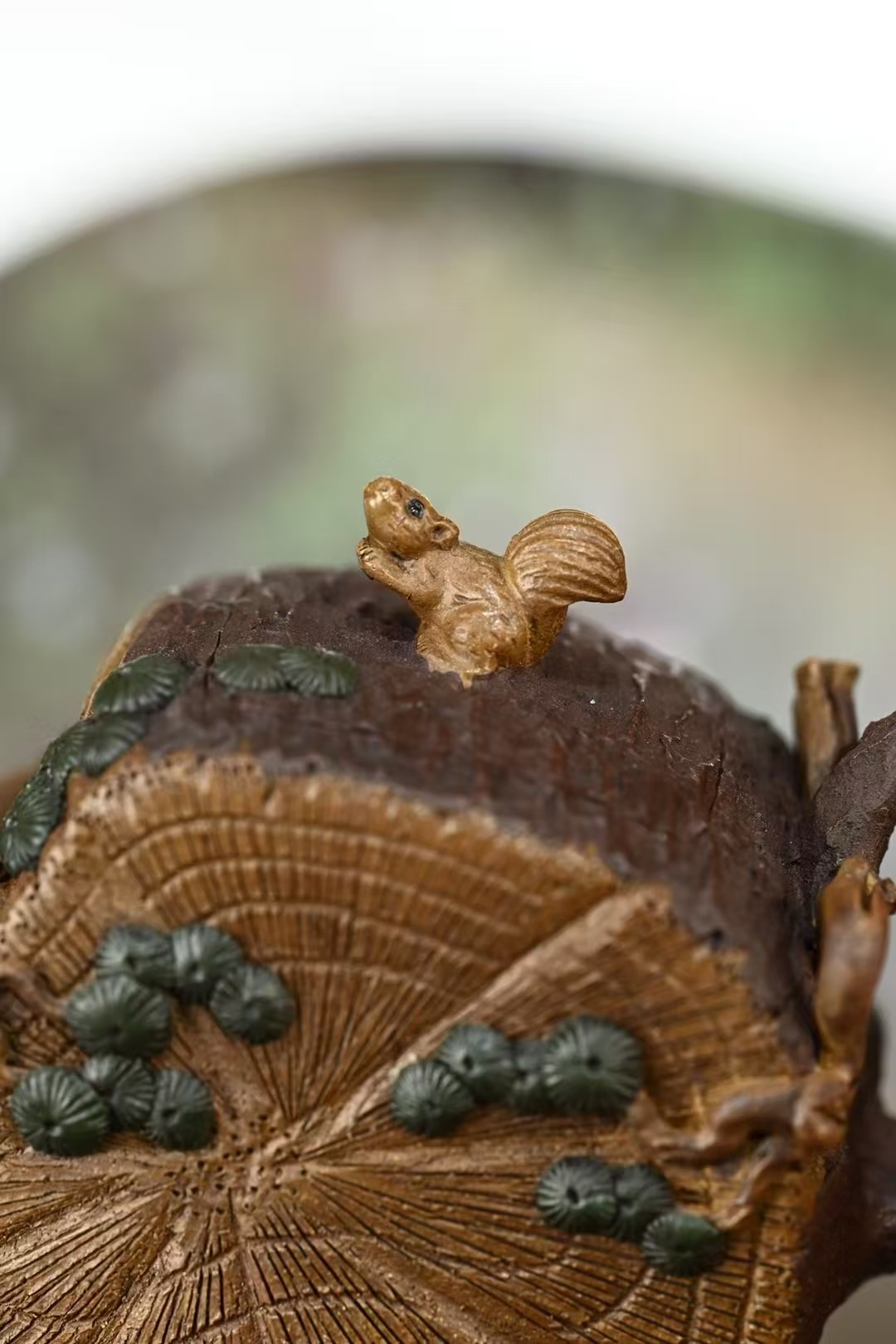 枯木逢春 手工制作, 容量330cc 老段泥料 高级工艺师 蒋锡坤作品 松桩形态,嶙峋老干,斑驳孔洞尽显沧桑感,极尽老辣,松风凌冽,山林萧肃,一只小松鼠正松枝间搜寻过冬的口粮,整器设计巧妙,生动自然,形意之间十分熨帖心灵。