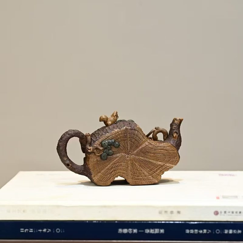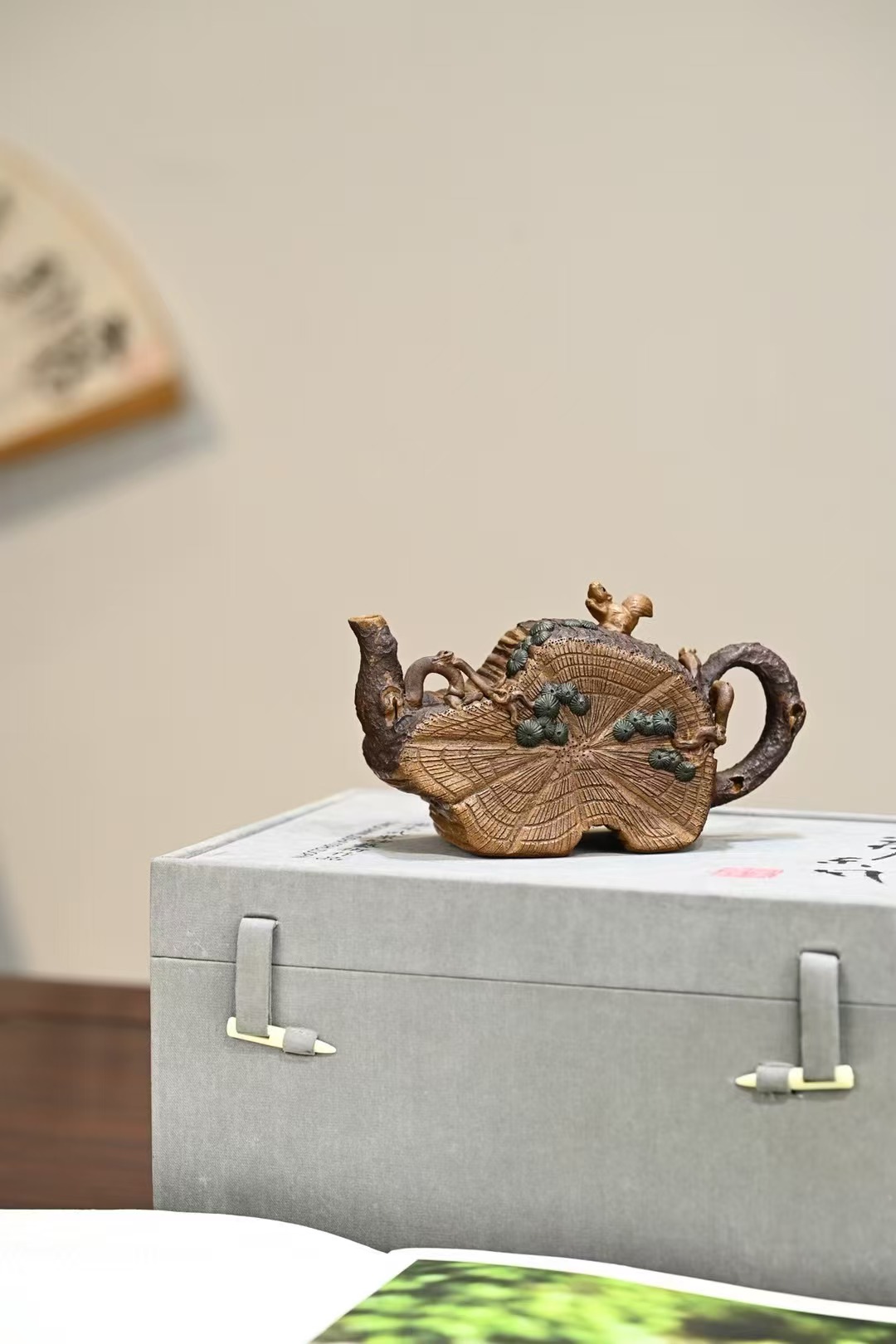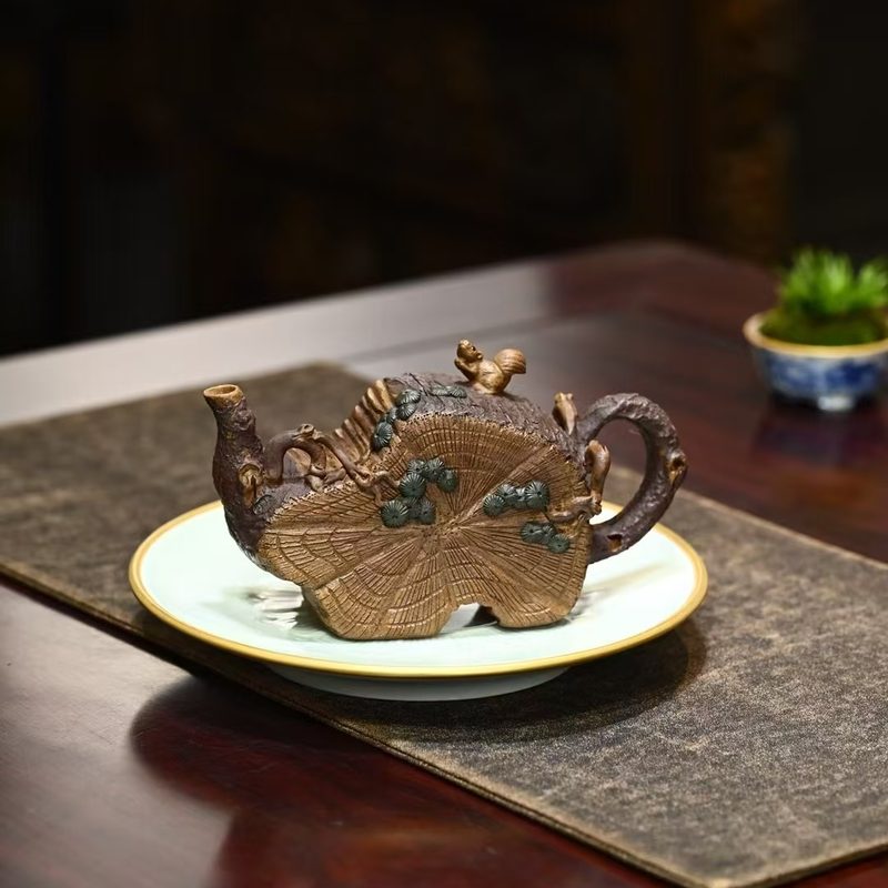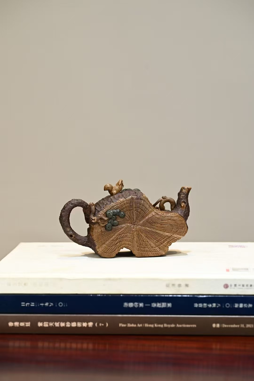 枯木逢春 手工制作, 容量330cc 老段泥料 高级工艺师 蒋锡坤作品 松桩形态,嶙峋老干,斑驳孔洞尽显沧桑感,极尽老辣,松风凌冽,山林萧肃,一只小松鼠正松枝间搜寻过冬的口粮,整器设计巧妙,生动自然,形意之间十分熨帖心灵。