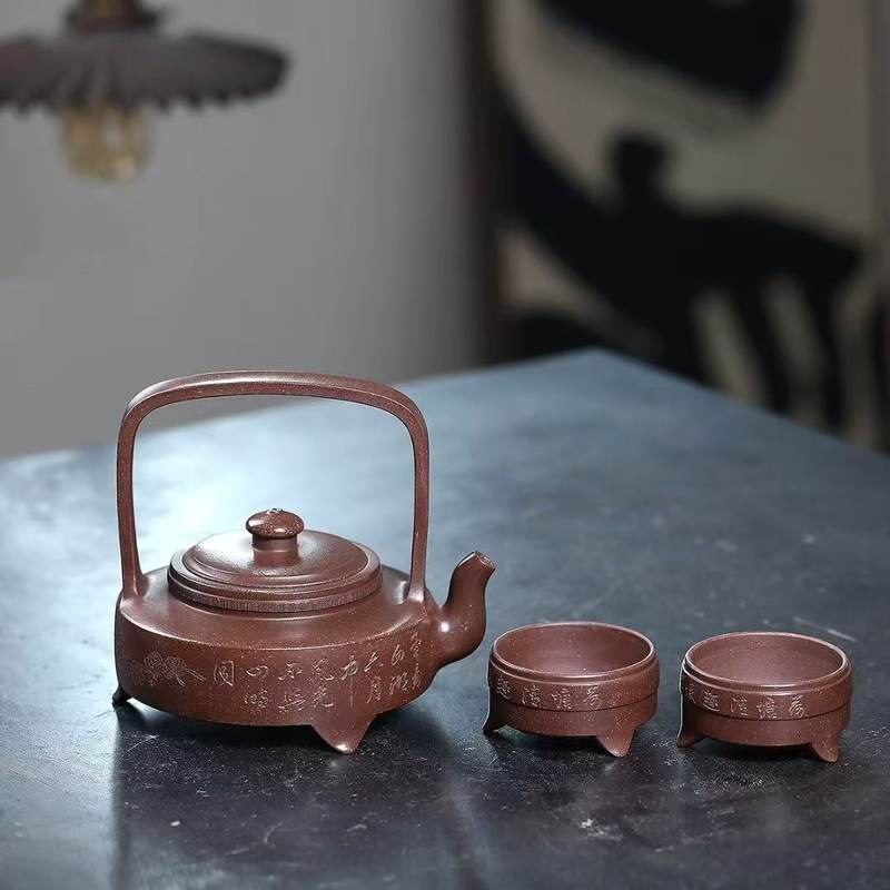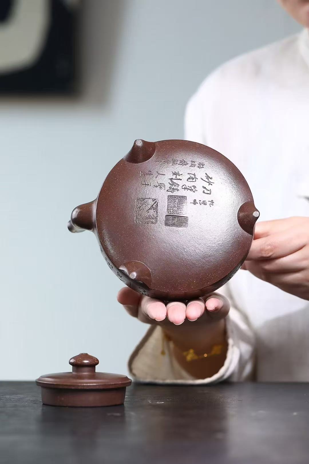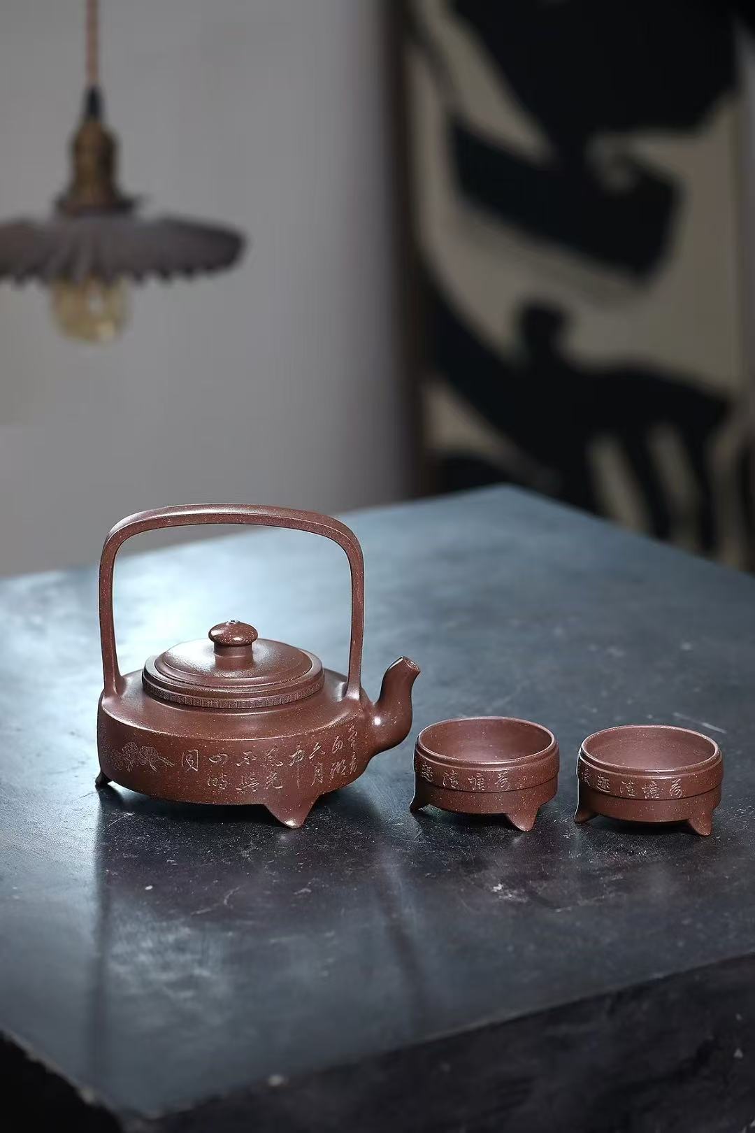三足言樽套组,手工制作, 容量壶500cc/杯子100cc 五四年一厂黑墩头泥料,作者 任俊寅(紫砂七老任淦庭嫡孙、顾景舟、吴云根弟子) "紫砂七老任淦庭嫡孙紫砂泰斗任仲光之子,百年任氏当代家主 缶硕后嗣"