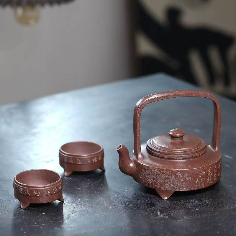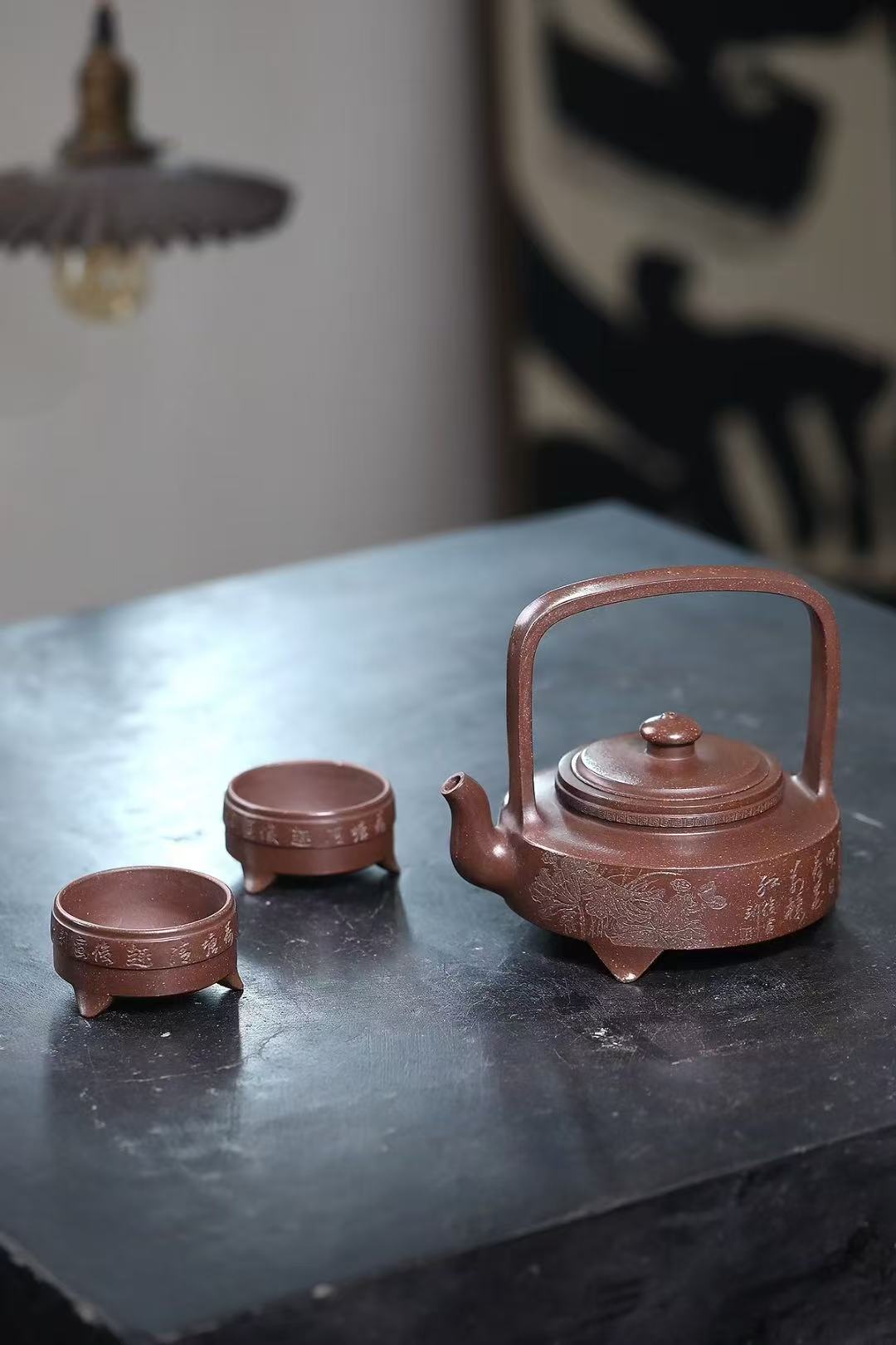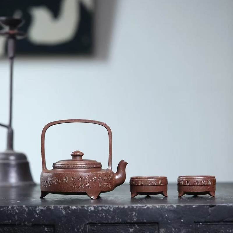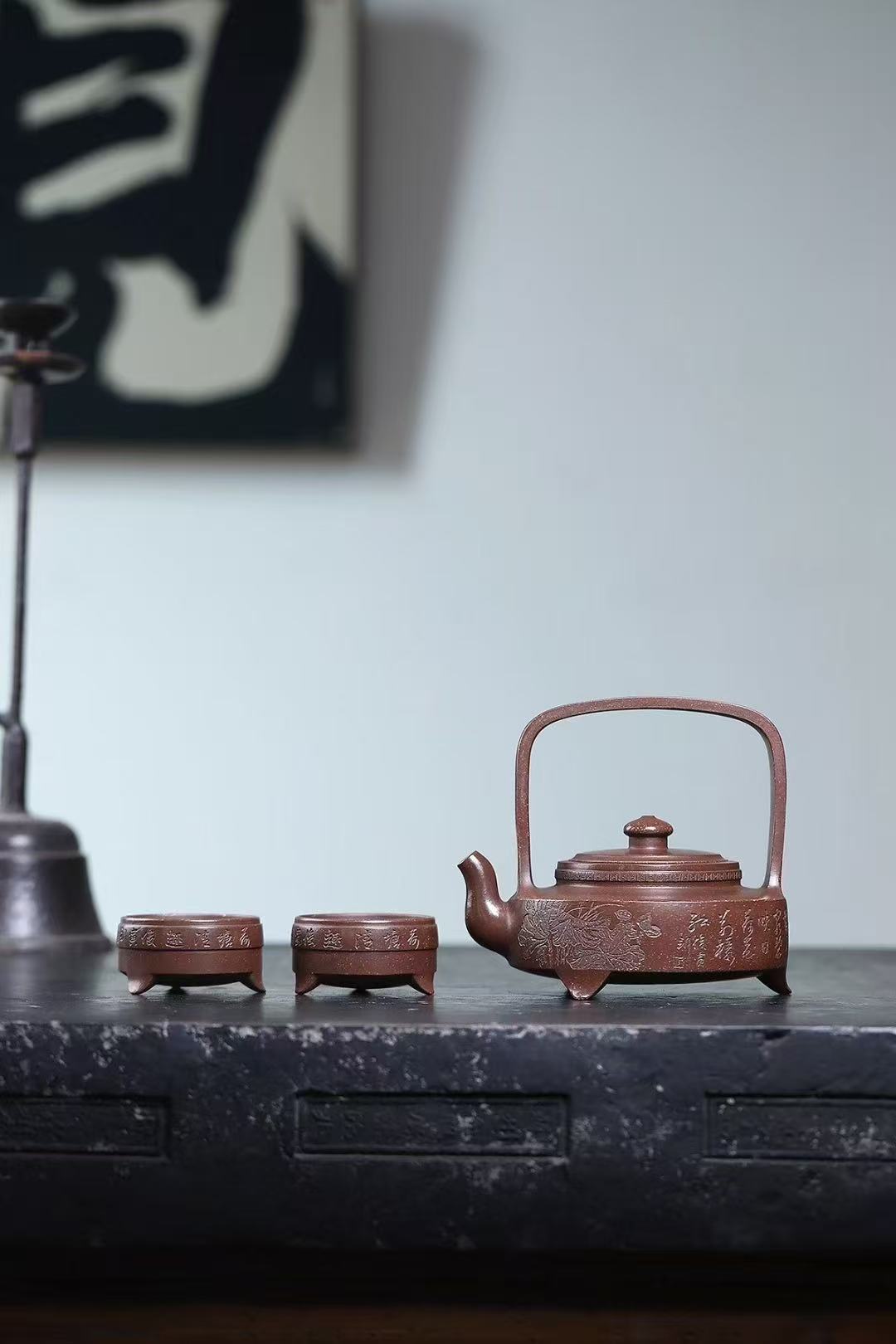 三足言樽套组,手工制作, 容量壶500cc/杯子100cc 五四年一厂黑墩头泥料,作者 任俊寅(紫砂七老任淦庭嫡孙、顾景舟、吴云根弟子) "紫砂七老任淦庭嫡孙紫砂泰斗任仲光之子,百年任氏当代家主 缶硕后嗣"