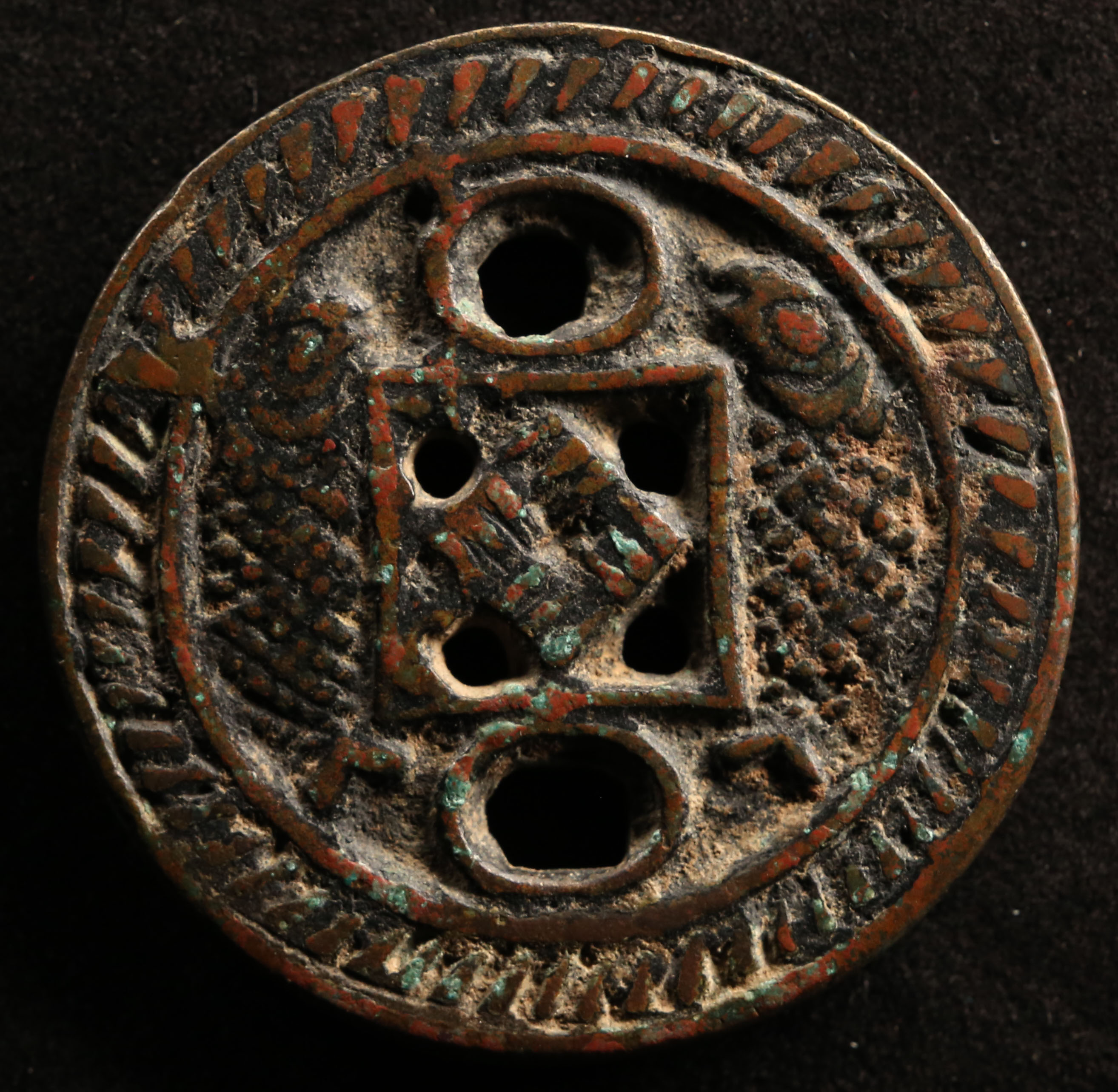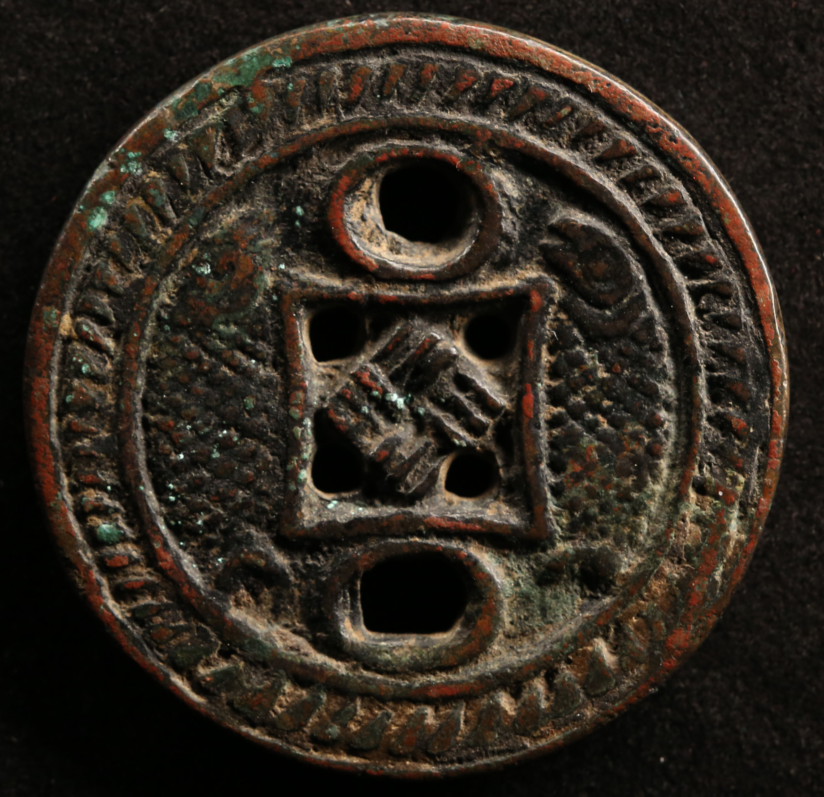 独特的形制,圆形的轮廓,中间却不是传统的单一方孔,而是在上下各开一个圆孔,中间留出一个方形的“结扣”状空隙。两侧,两条鲤鱼首尾呼应,鳞片在岁月的包浆下依然隐约可见。外圈,一圈整齐的锯齿纹(连珠纹)如同岁月的年轮,静静守护着这份古老的祈愿。